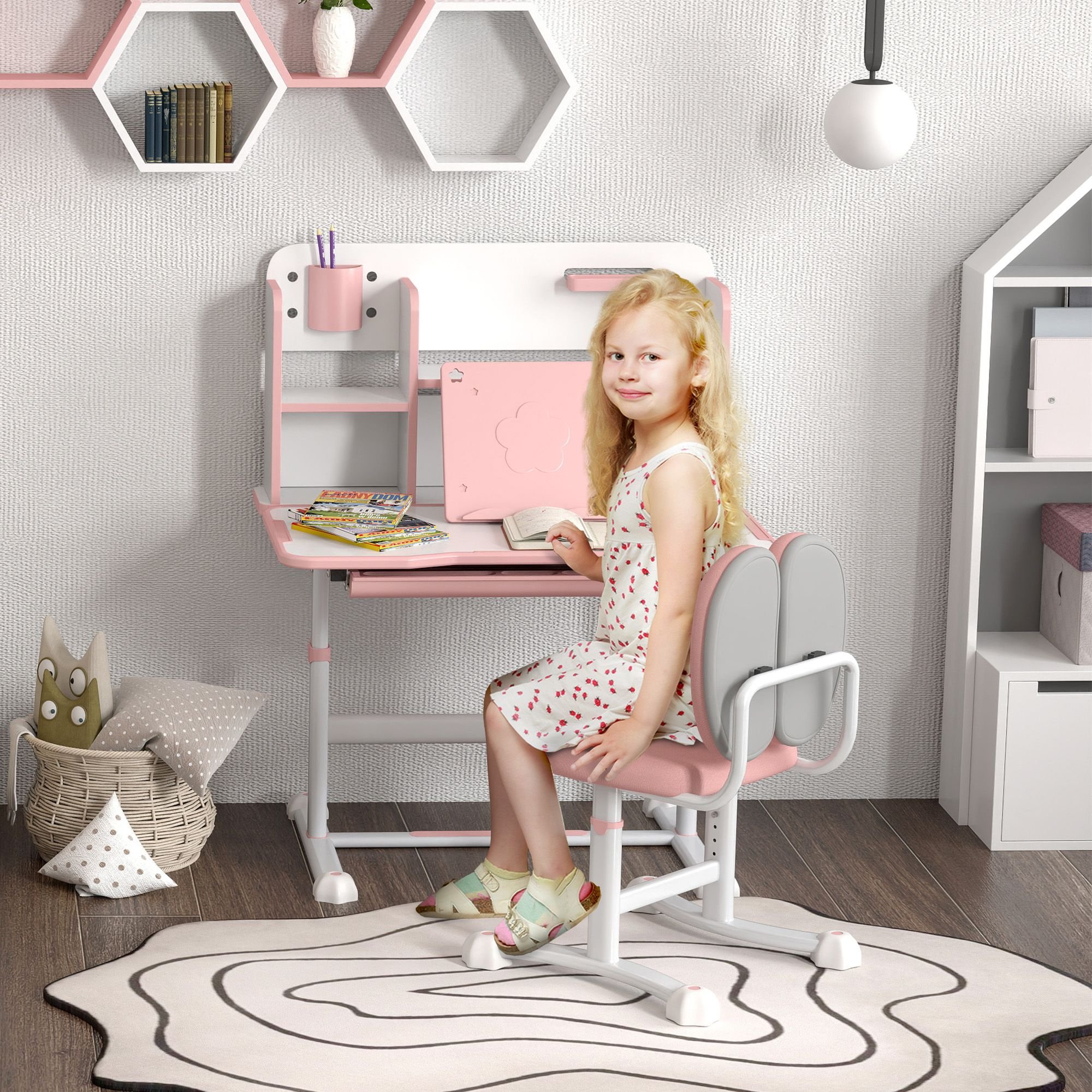 Height Adjustable Kids Desk and Chair Set for Writing Drawing w/ Tilt Desktop, Storage Drawer and Reading Rack, Pink