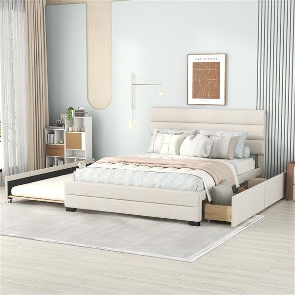 Queen Upholstered Platform Bed with Twin Size Trundle and Two Drawers, Beige Queen Upholstered Platform Bed with Twin Size Trundle and Two Drawers, Beige Queen Upholstered Platform Bed with Twin Size Trundle and Two Drawers, Beige