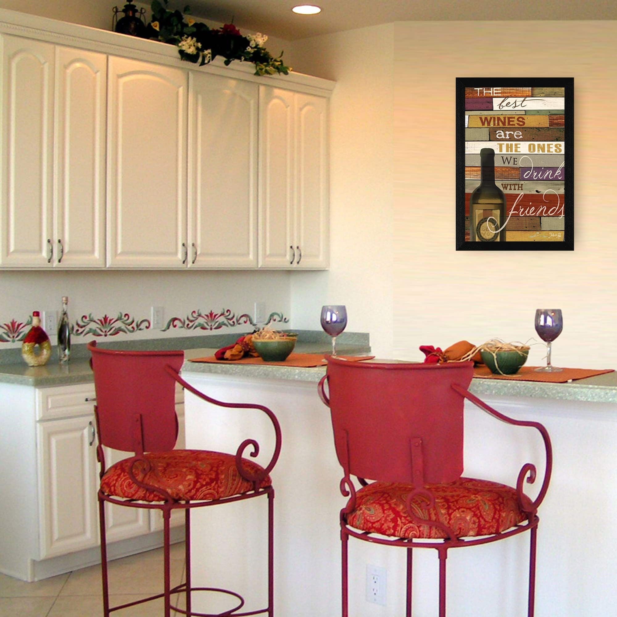 "The Best Wine" is a 14"x 20" black framed art print by artist Marla Rae. This artwork features a wood plank look, with a bottle of wine and reads the best wines are the ones we drink with friends. This totally American Made wall decor item features an decorative black frame. The print has a protective, archival finish (glass is not needed) and arrives ready to hang. •Women Owned (WBE)•Textured Artwork with a 'rolled on' acid free acrylic coating to create a canvas painting effect. No glass is necessary.•UV protectant coating protects artwork from fading.•Arrives Ready to Hang